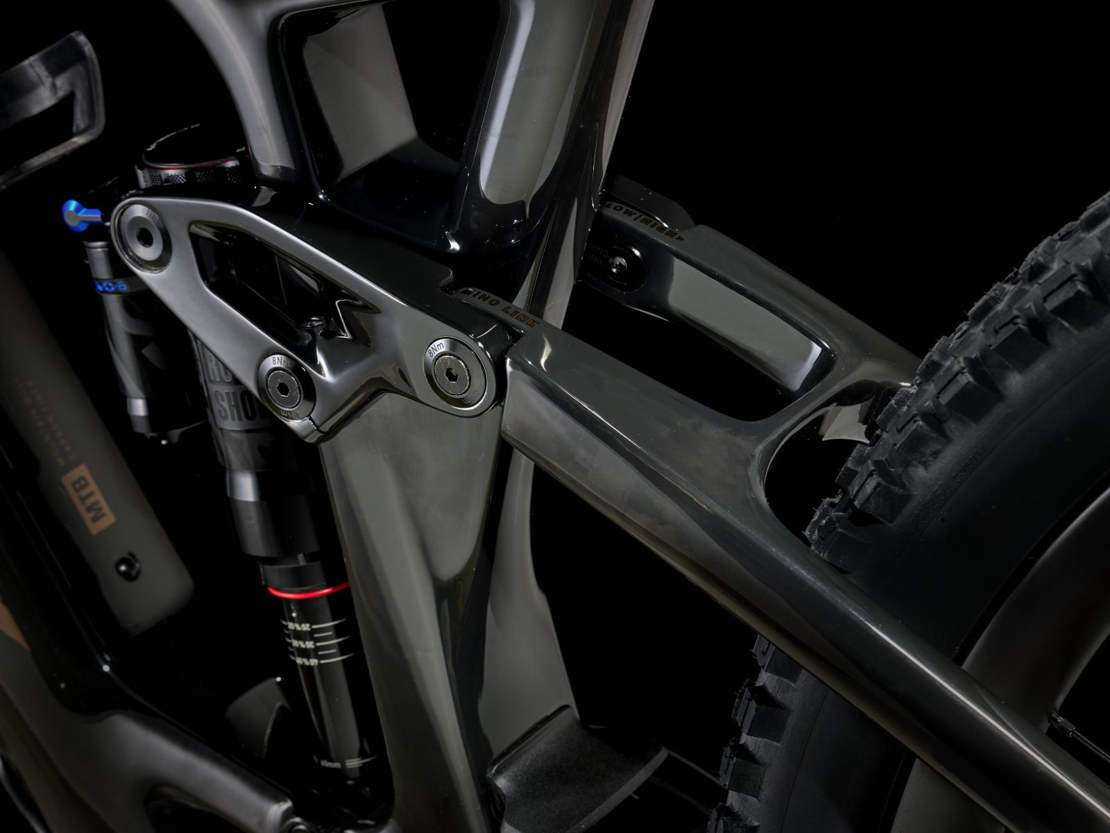 Rahmen: OCLV Mountain Carbon, herausnehmbarer Akku, interne Zugführung, Aluminiumumlenkhebel, 34,9 mm Sitzrohrdurchmesser, Aufnahme für obere Kettenführung, 55 mm Kettenlinie, Mino Link, ABP, Boost148, UDH, 140 mm Federweg
