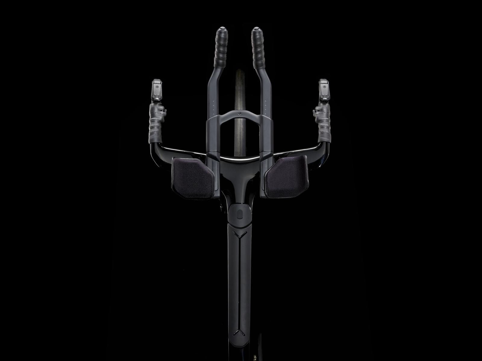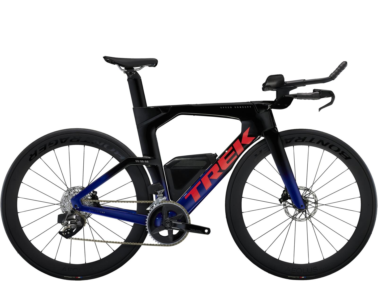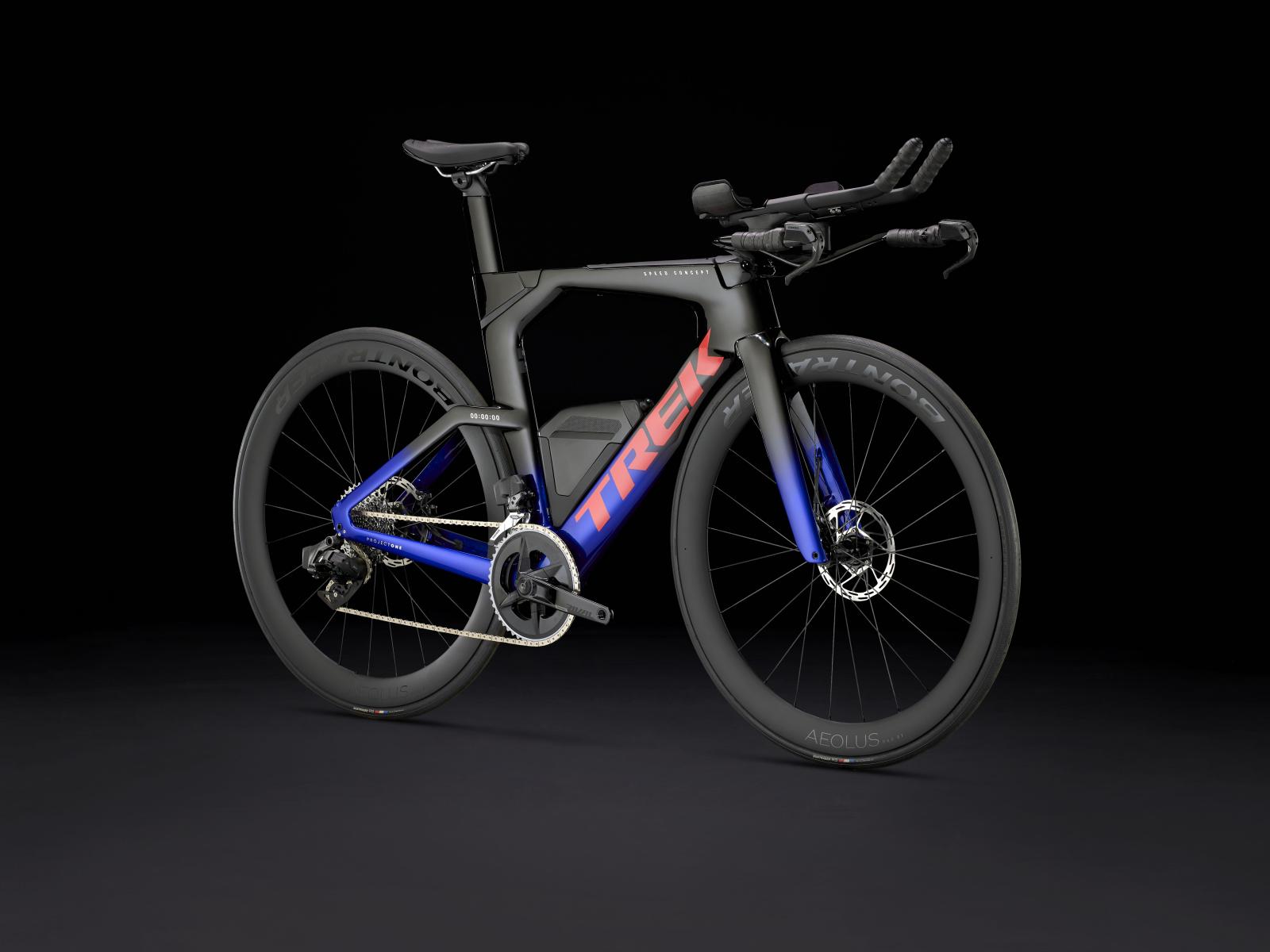 Einen ultraleichten Rahmen aus 800 Series OCLV Carbon, windschnittige Rohre mit Kammtail Virtual Foil-Profil (KVF), eine Speed Concept-Carbongabel mit aerodynamischem Profil, vibrationsdämpfendes IsoSpeed, integrierte aerodynamische Aufbewahrungslösungen für Verpflegung, Flüssigkeit und Pannenkit, einen drahtlosen, elektronischen SRAM Rival AXS 12fach-Antrieb mit SRAM AXS-Blips-Schalthebeln für eine aerodynamische Sitzposition beim Schalten, einen Rival AXS-Powermeter, einen vollständig integrierten Lenker samt Vorbau, einen triathlonspezifischen Bontrager Hilo Comp-Sattel für eine aggressive Aero-Sitzposition, zuverlässig zupac