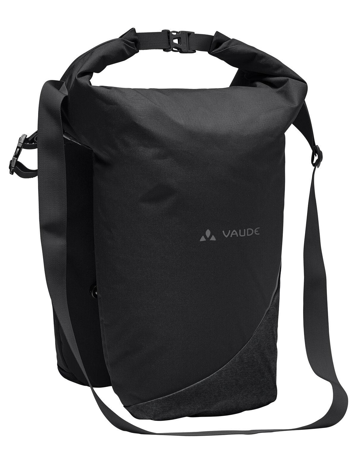 So einfach wie genial! Diese äußerst flexible Doppel-Packtasche wurde von unseren Produktentwicklern auf die Bedürfnisse aller Radler zugeschnitten, die es einfach und praktisch mögen. Nur eine große Öffnung ermöglicht einen raschen Überblick und macht eine gute Organisation beider Seitentaschen kinderleicht. Das hohe Packmaß schluckt sogar Baguette oder Posterrollen. Ein Reißverschluss sichert den Inhalt vor Zugriff oder Herausfallen. Wird nicht das ganze Volumen benötigt, kann der obere Bereich gerollt und mit einem Klickverschluss verschlossen werden, so dass die gesamte Taschenkombination wie ein Shopper oder mit dem fixierten, längenverstellbaren Gurt über der Schulter getragen werden kann. Beide Taschen können unten über Druckknöpfe verbunden werden. In der linken Seitentasche finden sich ein leicht gepolstertes Fach für DIN A4 Unterlagen sowie ein kleines, mit Reißverschluss verschlossenes Wertsachenfach und ein Schlüsselhalter. In der rechten Seitentasche sorgt ein geräumiges Einschubfach für übersichtliche Trennung von Wechselsachen und Einkäufen. Je eine Schiene mit Haken sichert die Seitentaschen am Gepäckträger. Ein farblich abgesetztes Band mit einem Klickverschluss fixiert die Tasche zusätzlich an der Sattelstütze. Seitliche VAUDE Reflexdrucke sowie rückwärts gerichtete großzügige Reflexelemente erhöhen die Sichtbarkeit im Verkehr. Die im Lieferumfang enthaltene Regenhülle schützt Tasche wie Inhalt auch in voll gepacktem Zustand.